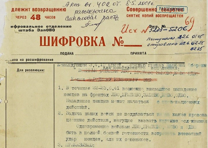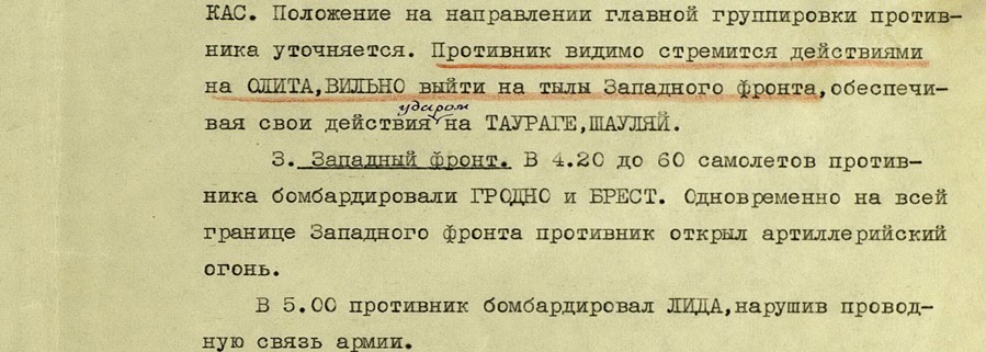 «Наконец из Москвы поступил приказ немедленно ввести в действие «Красный пакет», содержавший план прикрытия государственной границы. Но было уже поздно. В третьей и четвертой армиях приказ успели расшифровать только частично, а в десятой взялись за это, когда фашисты уже развернули широкие военные действия.