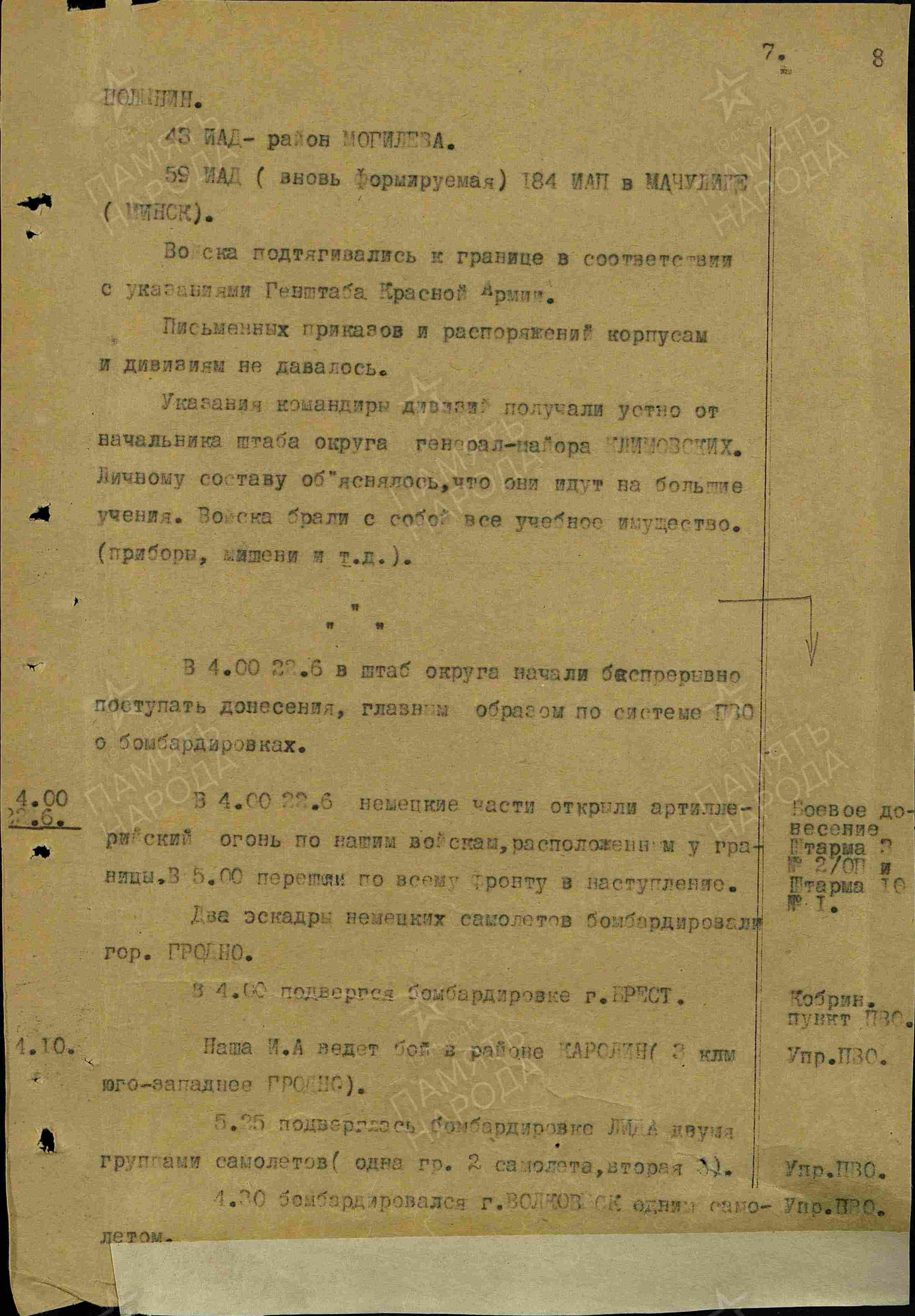 «… От командующего 10-й армией – «все спокойно»; от 4-й армии – «всюду и все спокойно, войска выполняют поставленную вами задачу». На мой вопрос, выходит ли 22-я танковая дивизия из Бреста, получил ответ: «Да, выходит, как и другие части». Командующий 3-й армией ответил мне, что у него ничего нового не произошло. Войска Иванова – начальника укрепрайона – находятся в укреплениях, 56-я стрелковая дивизия выведена на положенное ей место по плану; 27-я стрелковая дивизия тоже на своем месте, она примерно за месяц до начала военных действий мною была переведена из Сопоцкин – Гродно на Августов – Граево, Сухового. Эти места утверждены Генеральным штабом.