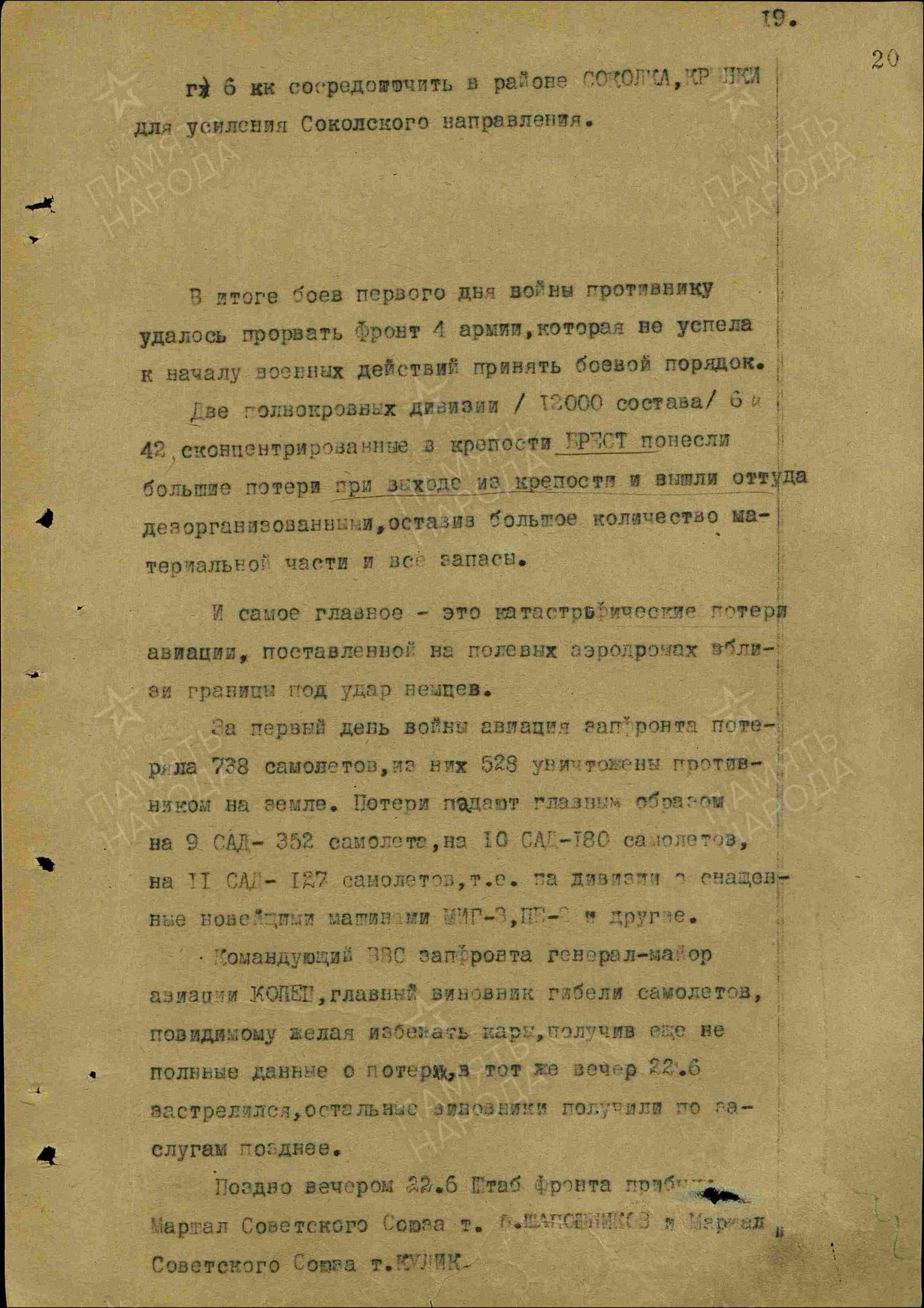 3) Теперь при анализе совершившихся событий стало ясно, что отдельные работники ГШ, зная, что в первый период войны превосходство в реальных силах будет на стороне Германии, почему-то проводили и разрабатывали главным образом наступательные операции и только в последнее время (в конце мая 1941 г.) провели игру по прикрытию границы, тогда как нужно было на первый период войны с учетом внезапности нападения разработать и оборонительные операции.»