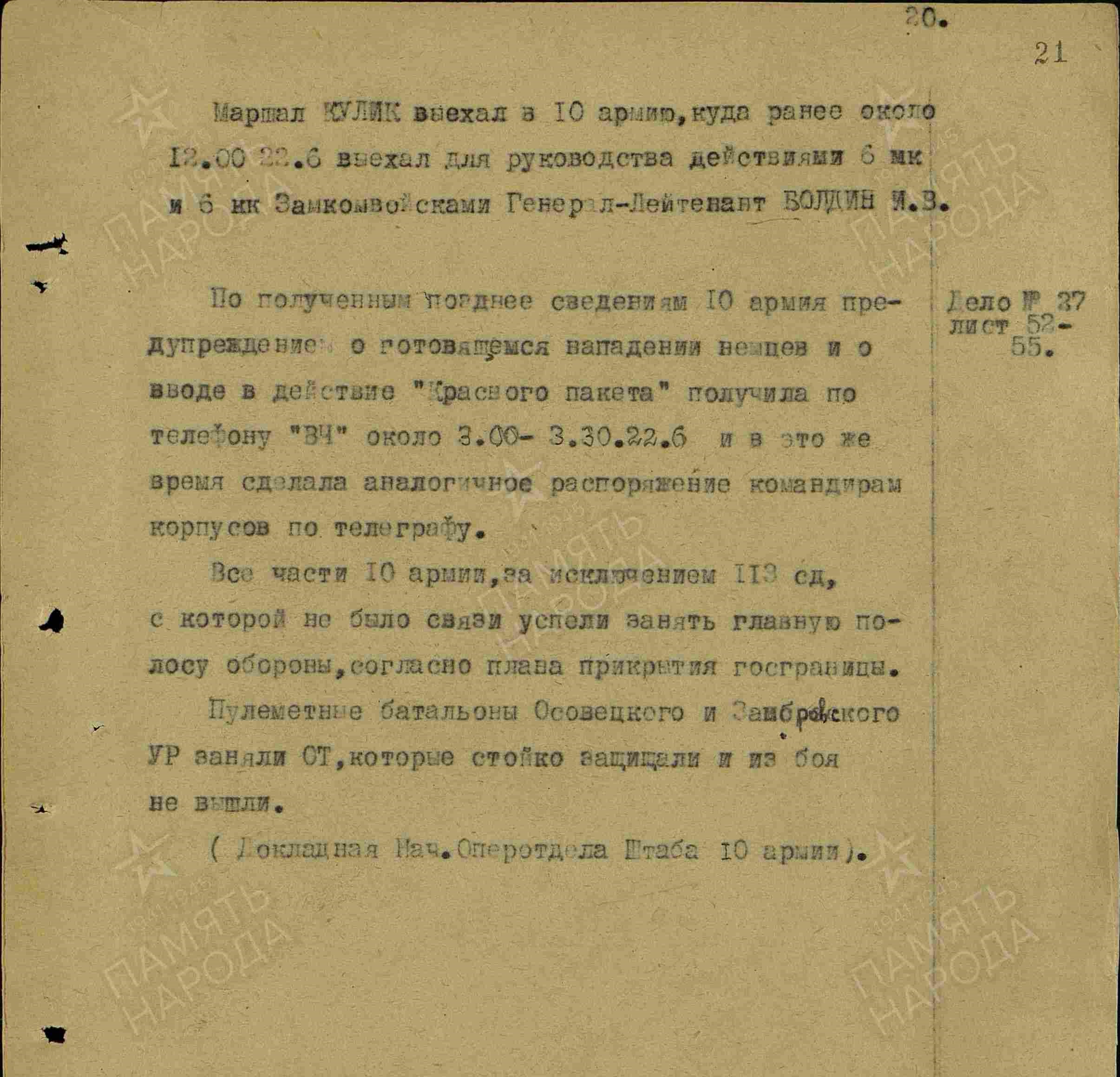 В это же время через капитана штаба армии получил пакет, в котором был предупреждающий приказ за подписью Наркома Обороны т. Тимошенко о выводе войск на исходные рубежи, но приказ был получен тогда, когда дивизия потеряла 1/3 своего состава.